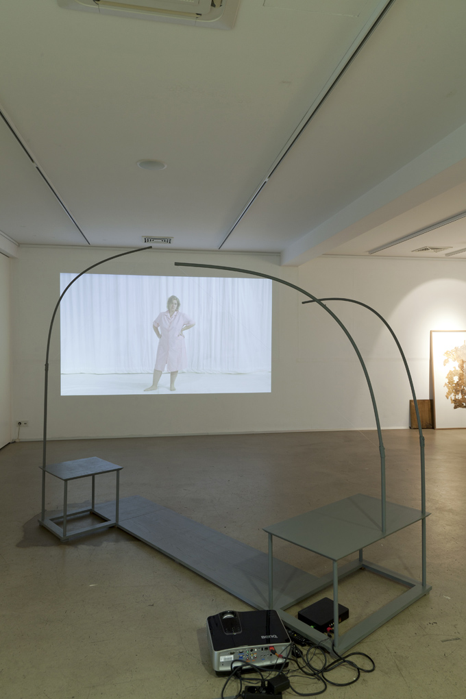 The Board 3, invisible and only printed on a transparent foil in London, appears again as a sculpture, painted in dark grew, a diagonal shadow and without an object, in similarity to Cole in her video, a carer without any vis-à-vis.