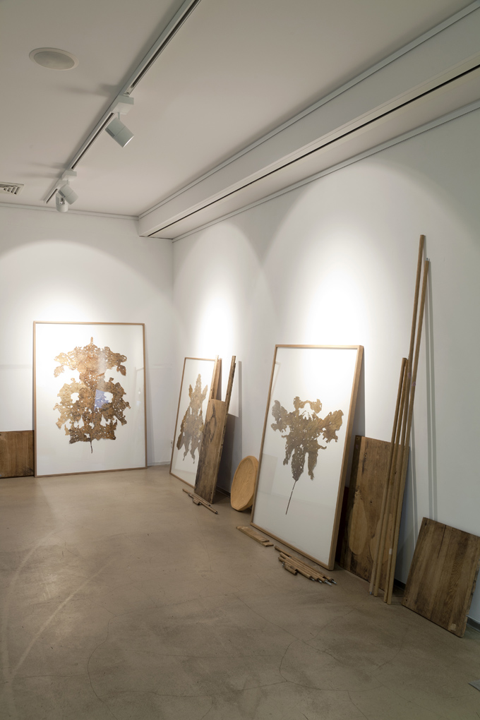 Dettwiler’s practice uses various artistic methods to develop strategies and representational forms of naturalized artificiality. Her rearrangements of natural history reveal our deep connections to, whilst simultaneously thinking ourselves outside, nature. The plant leaves in in this work are manipulated in such a way that they refer to a deep psychological dimension as „Rorschach pictures“ and to show „nature“ as the projection surface of human longings and fears.