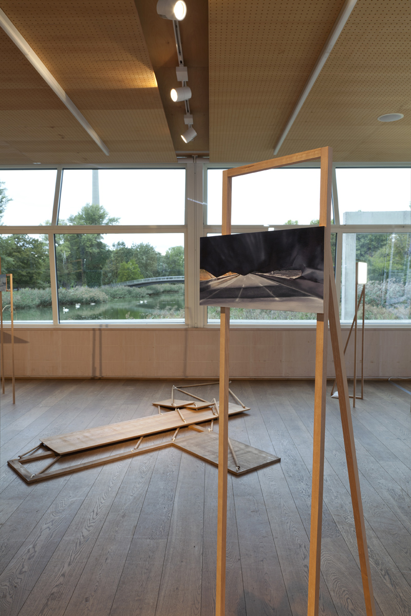 As reaction on Eggebert’s installation Rink is laying her Assemblage Board 2 next to it on the floor – using the axonometric view. The similarity of the material of the wooden floor and the board evokes a merge of one into the other, a camouflage effect similar to the new moon, where the object (subject) is hidden, but still present.