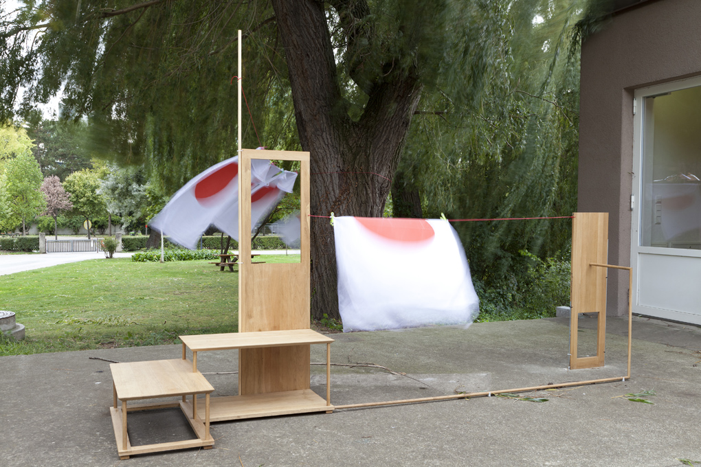 Community produces history. As the host of Ebata’s flags that need to dry after washing, the installation of Board 7 at the back terrace in front of the installation of „Washing Hinomaru“ also serves as a vantage point for a long clothesline pointing into the infinite space of the park.