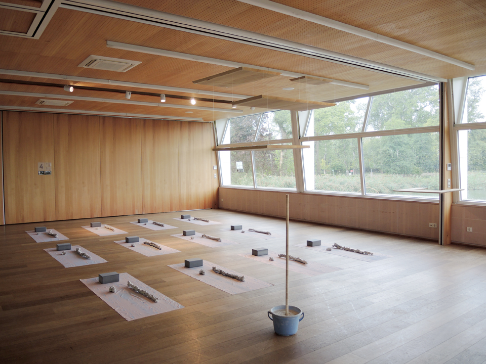 Next to the installation of Ben Cain a 1:1 mock-up of Board 4 – made of paper and covered by printed oak patterns – is placed by Rink. In dissoluting and dissolving, the model starts to lift to the ceiling, anchored just by the plastic pot filled with concrete, that was already in use in Zenpukuji Park in Tokyo. The title, taken from one the original names of the Eight Views, relates to the etheric aggregate of the sculpture in relation to the Yoga quote in Cain’s artwork.