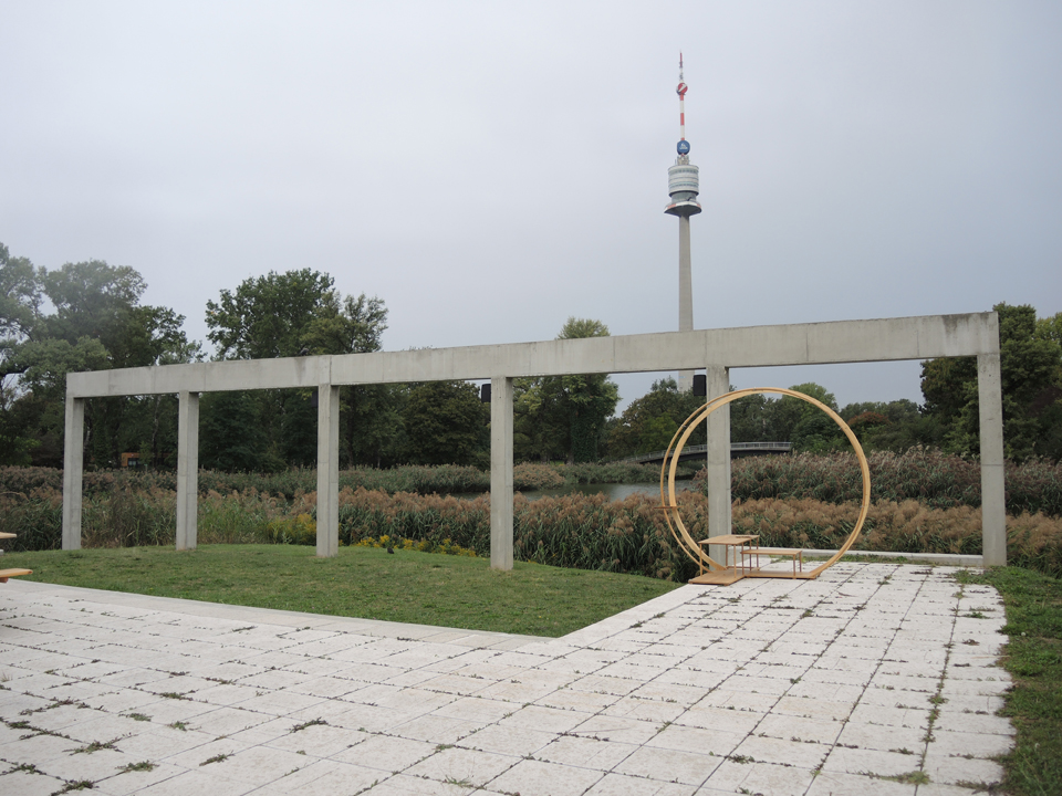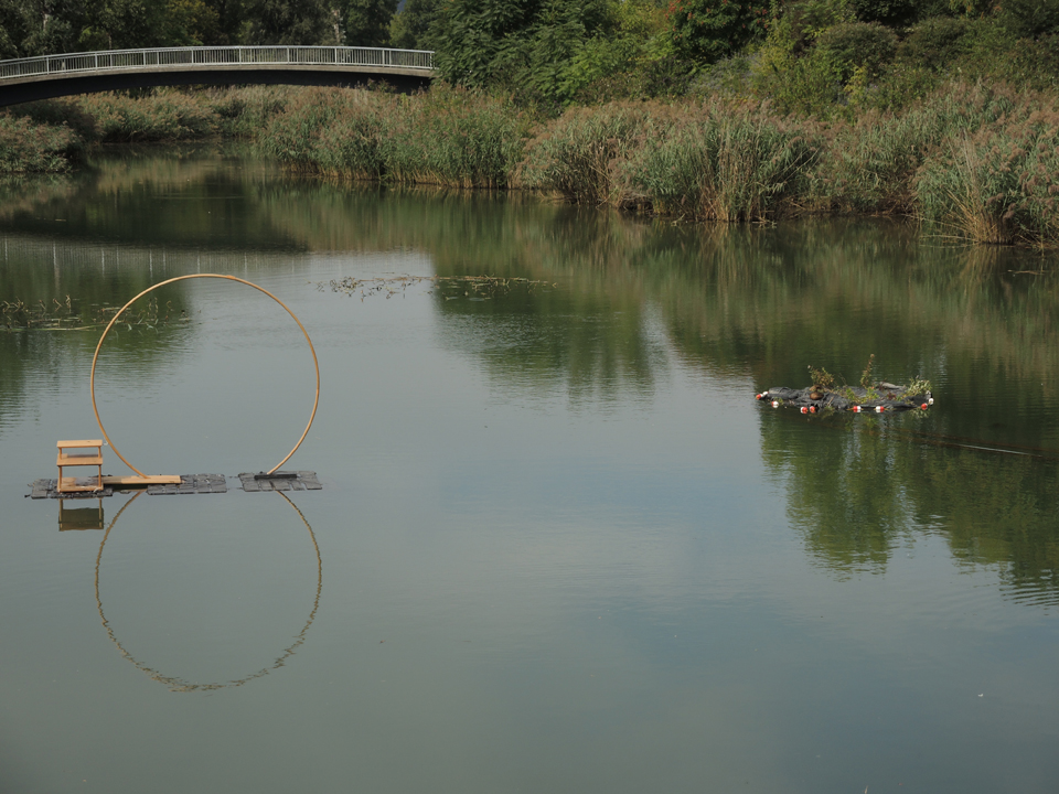 Sharing the spot of Irissee at Donaupark in front of the pavilion, the Board 6 becomes a floating raft. Bond at a tap of the lake’s fountain, its position and reflection is changing due to the weather conditions. The round becomes an eight in the mirror of the still water surface – pointing at the Eight Views as a inherent and underlying structure.