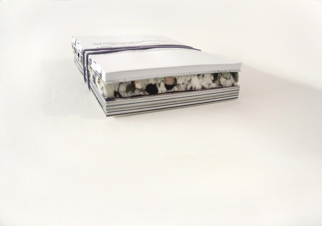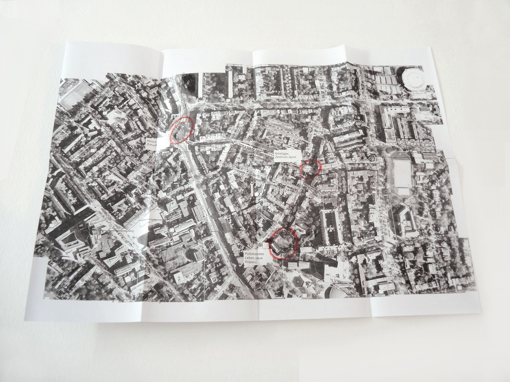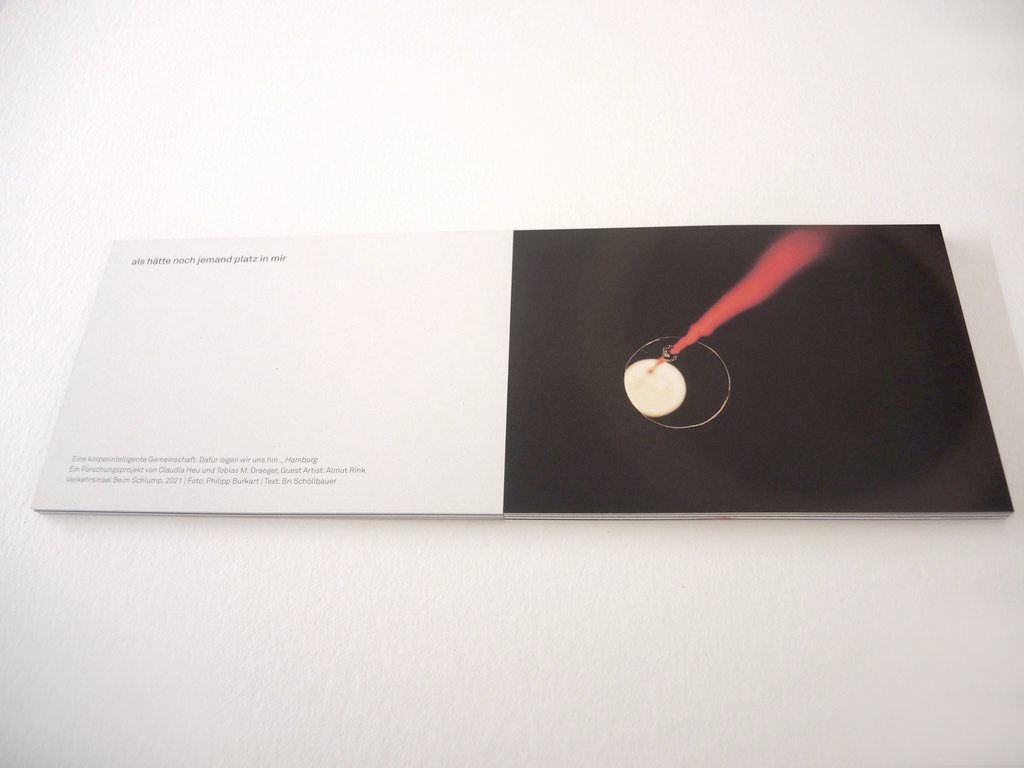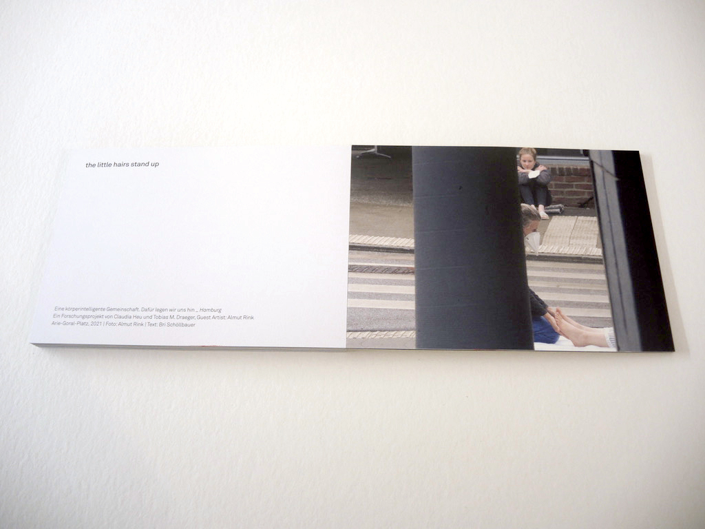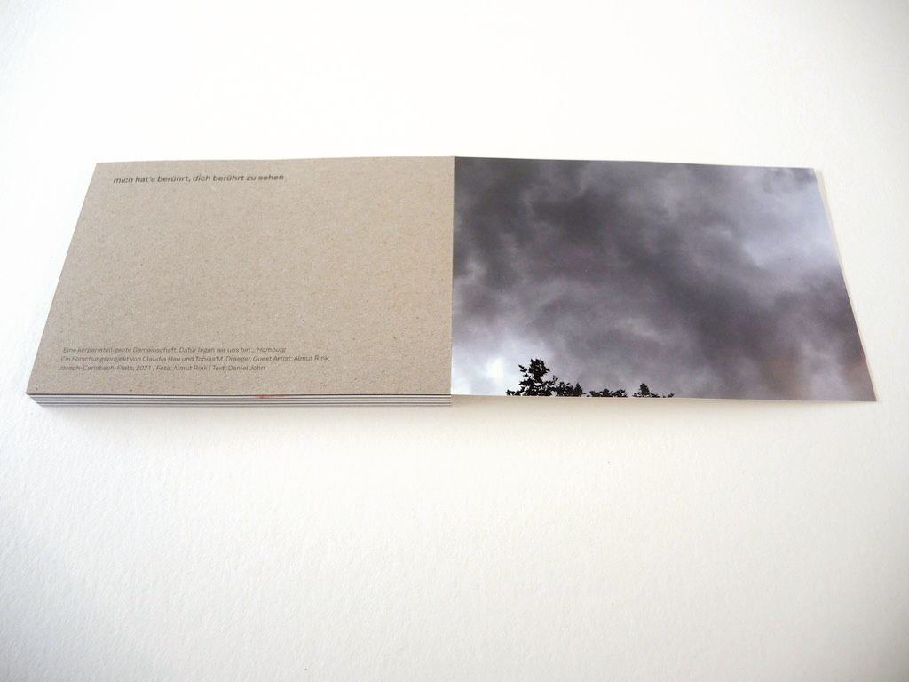 The publication consists of four parts: a textbook, a booklet of 27 postcards printed on 9 different papers, a map of Hamburg on which the three locations of the performance are drawn, a piece of the original mat on which the participants have laid down. The different parts of the publication reflect the haptic sensing – the touch as an important experience within the whole project.