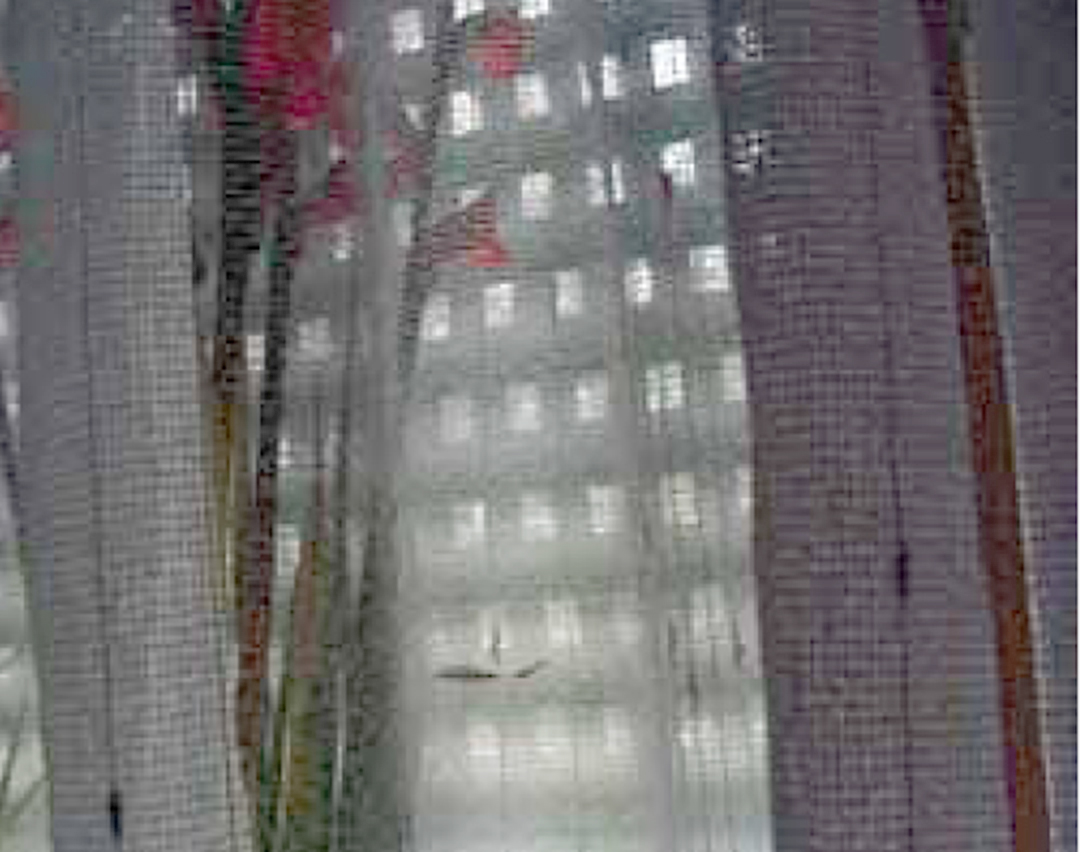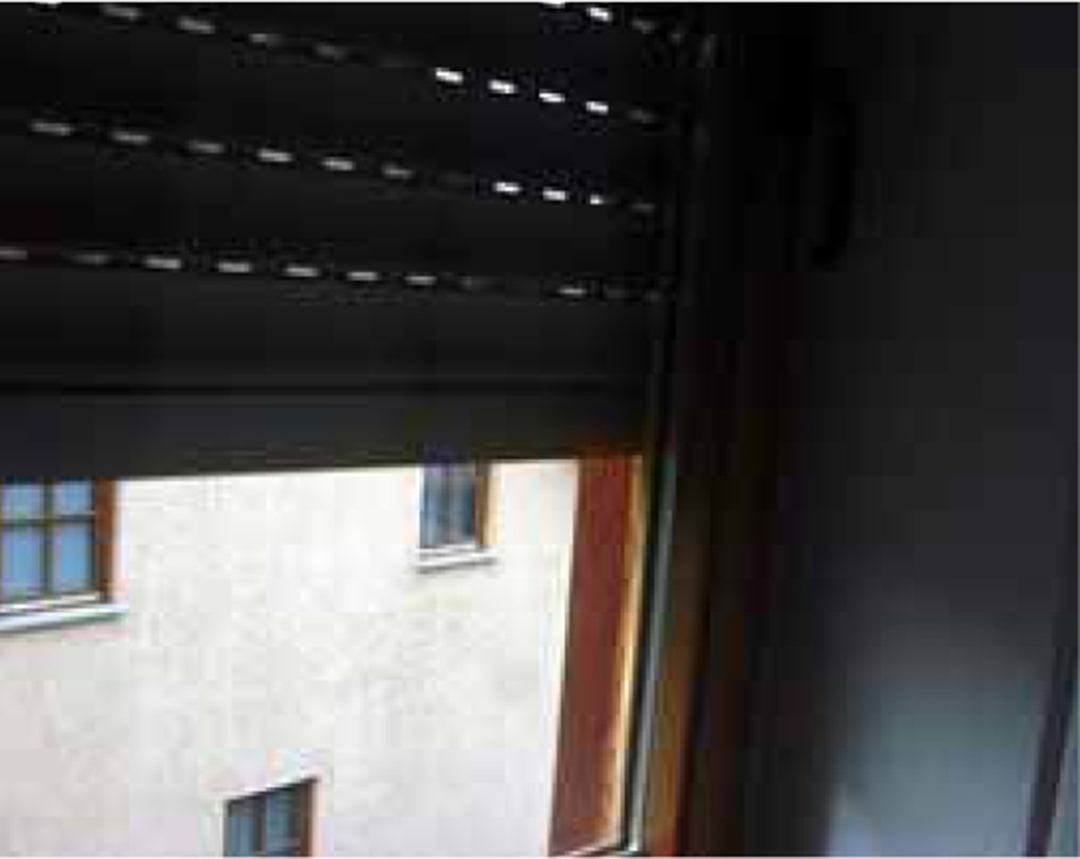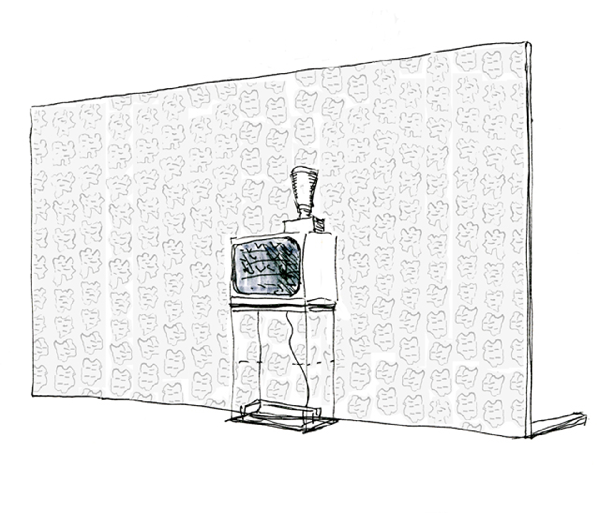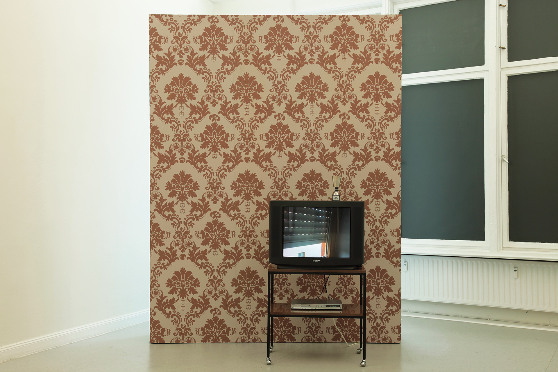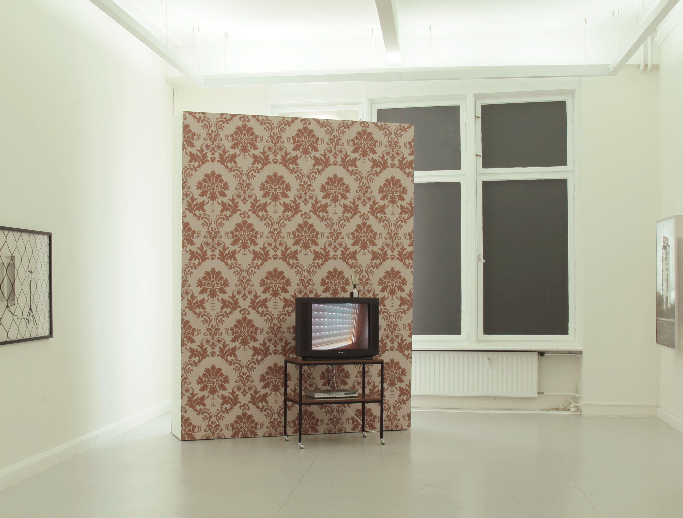 This Installation describes the ambivalence of the private zone, which, alongside its protective function also results in isolation from the outside world. This is exemplified by private homes in the former GDR, mass-constructed prefabs erected within a very short time after German reunification and privatization that went along with it. The spatial element suggests an interior: a wall with a patterned wallpaper. On the surface, this paper first comes across as a harmless interior décor. A second glance, however, reveals its xenophobic contents: icons of surveillance cameras and logo quotes from vigilante groups and neighborhood watch groups appear. Embedded as they are into the pattern repeat, they merge into the camouflage of innocuous ornaments of nature. The TV acts as a „window to the world“ and stands metaphorically for this cocooning in the own home, as does the film that is shown of the shutters being vehemently closed as someone walks through a house. on top of the TV set is a trophy cup to commemorate the own position of victory.