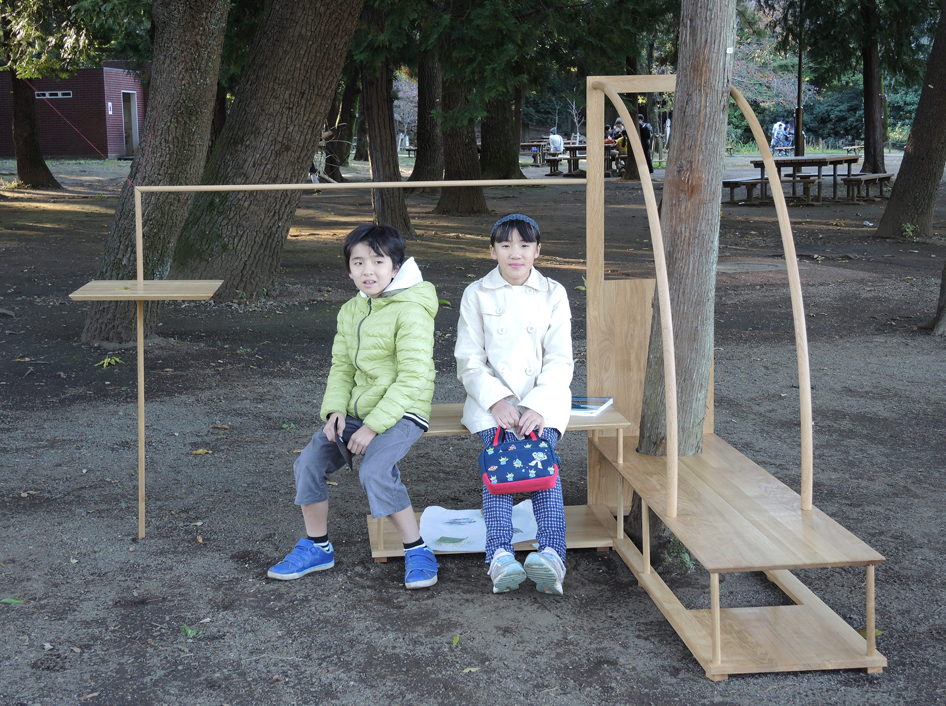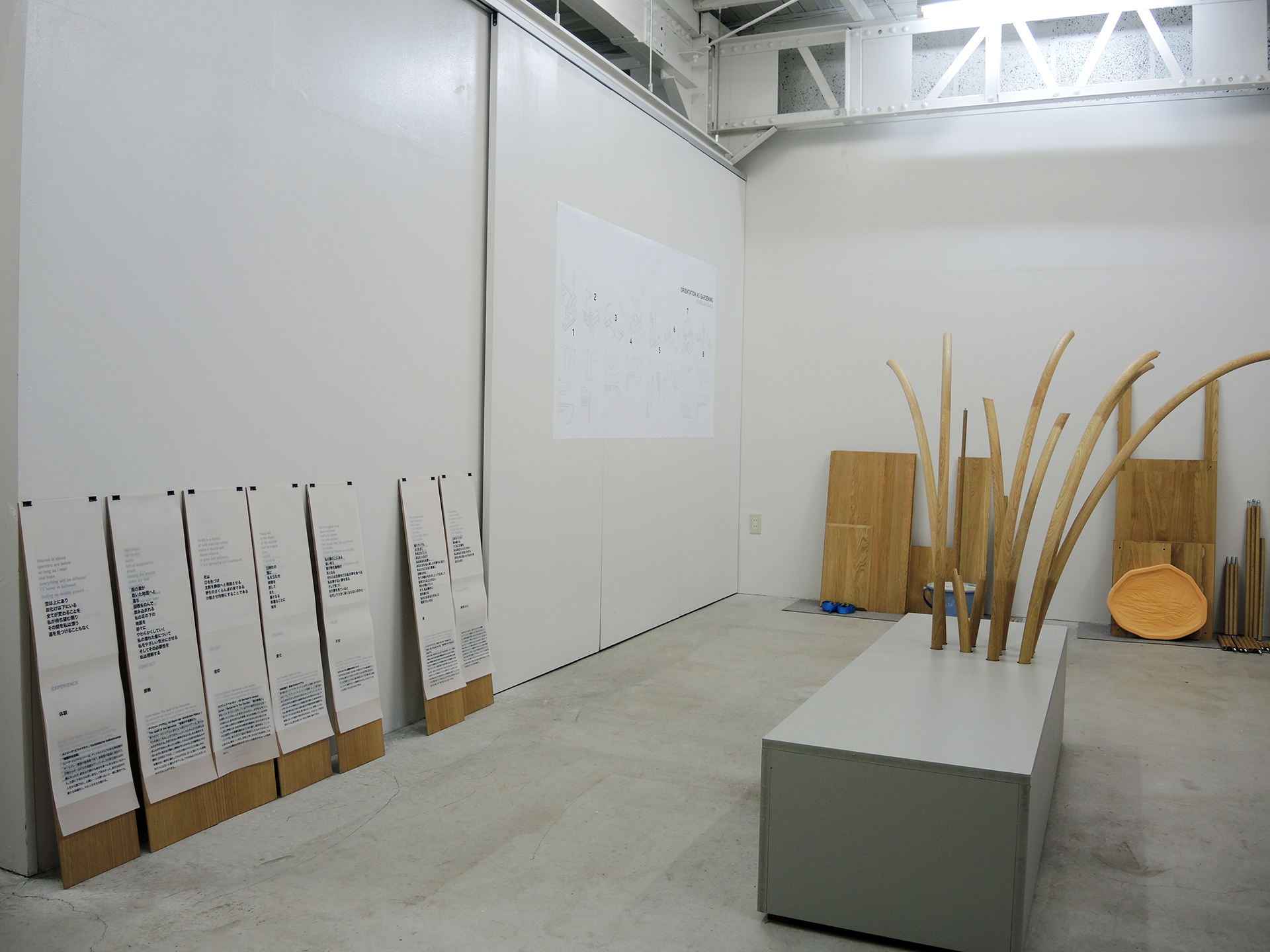 A series of arrangements have been developed: Eight Assemblage Boards and eight pieces of text will be installed in Zenpukuji Park and in the gallery of Youkobo Art Space. Based upon classic Shohin displays – small scale indoor shelves for plants and stones – the boards have been enlarged to human scale and transfered into public space. Frame and furniture in one, they have been adapted to the specific conditions of their respective environments in the park. These eight sites compose an array of perspectives and represent at the same time an infinite number of possible further options. In addition, eight texts have been developed: From eight different books, one essential word has been filtered and subsequently a poem developed out of it.